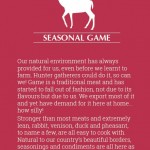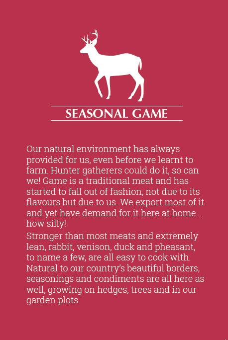 Seasonal Wild Game is always close to our hearts, including Venison, Rabbit, Pheasant and Duck, a few tasty treats from some famous peeps.