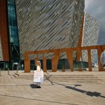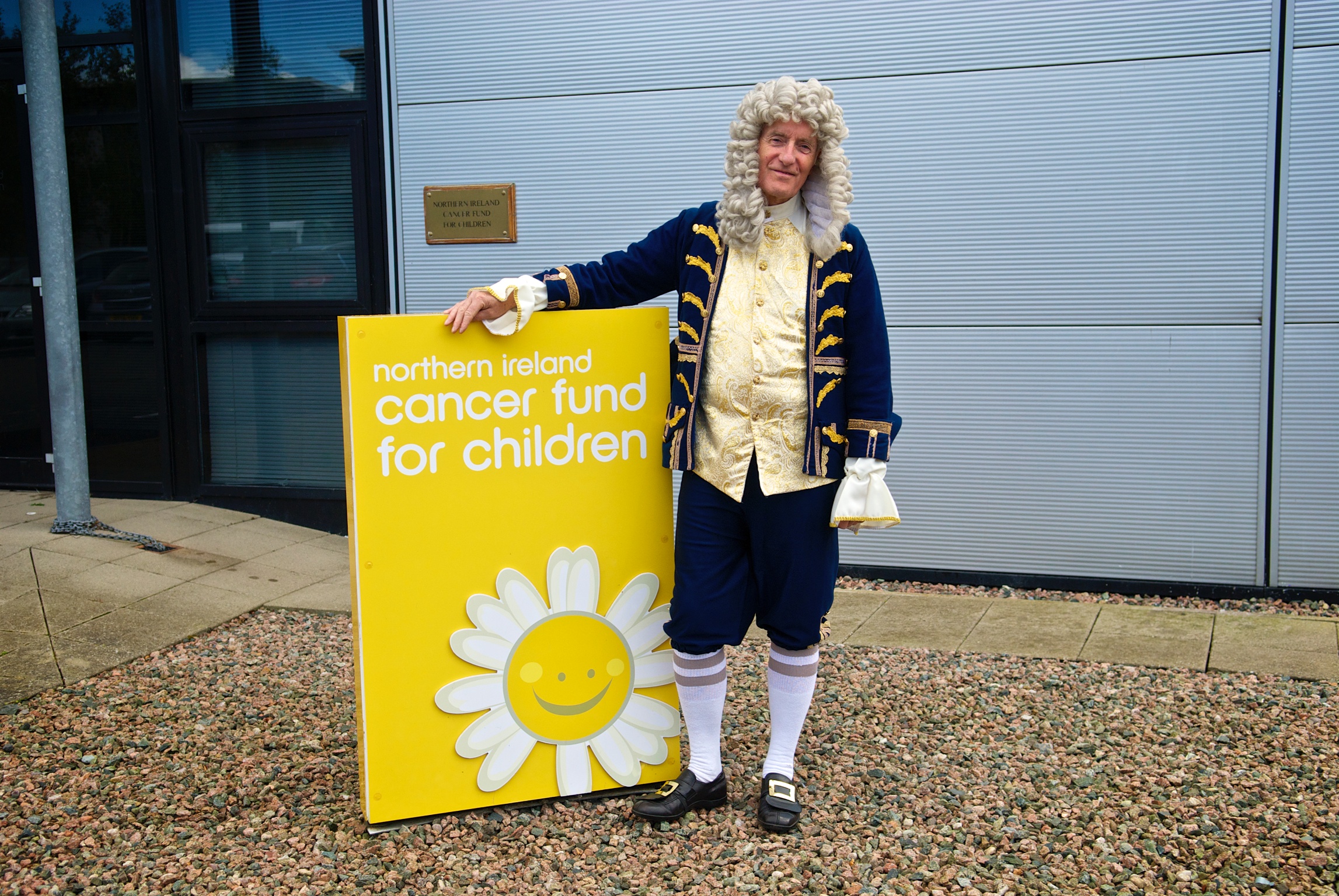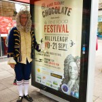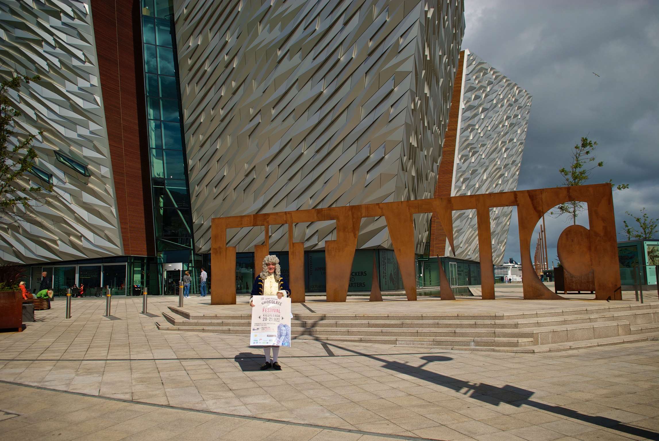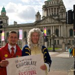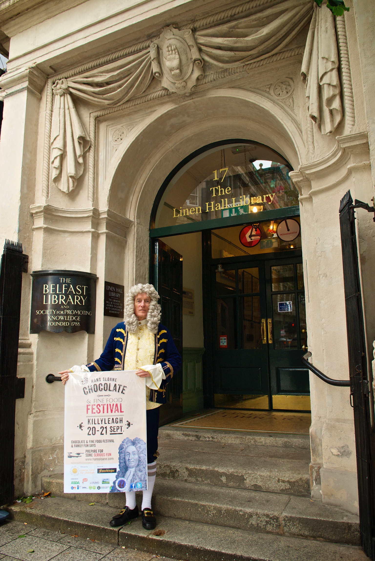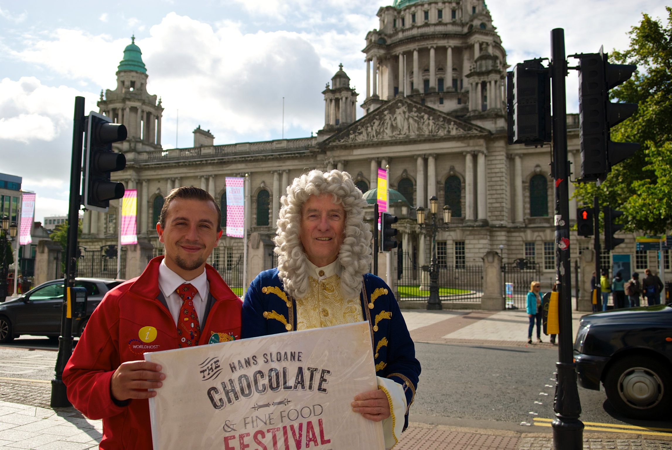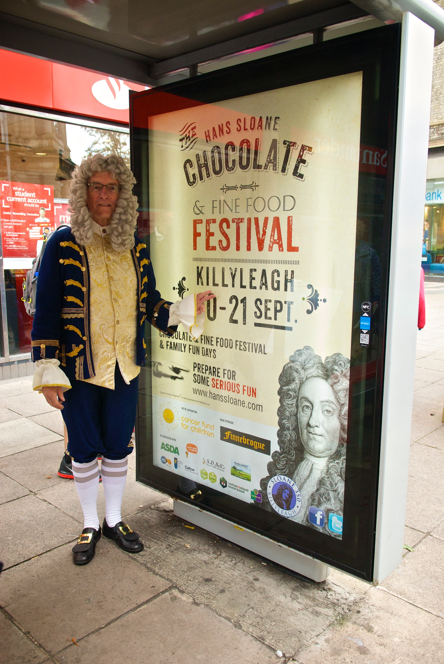 This morning 20 billboards and a number of Adshels in and around Belfast featured this year’s Sloane 350 Chocolate and Fine Food Festival which takes place under marquee on Saturday 20 and Sunday 21 September at Killyleagh Castle. This is the third biennial chocolate and fine food festival and it gets bigger and better every time and as a result Sir Hans Sloane aka local historian Clive Scoular decided to visit Belfast’s iconic tourist sites to spread the word. He visited Belfast City Hall which is also a European Heritage Open Day venue, Belfast Visitor’s Centre, the wonderful Linen Hall Library, Titanic Centre, Ulster Museum etc and QUB where he was greeted by Killyleagh Festival Chairman Prof Bob Elwood.