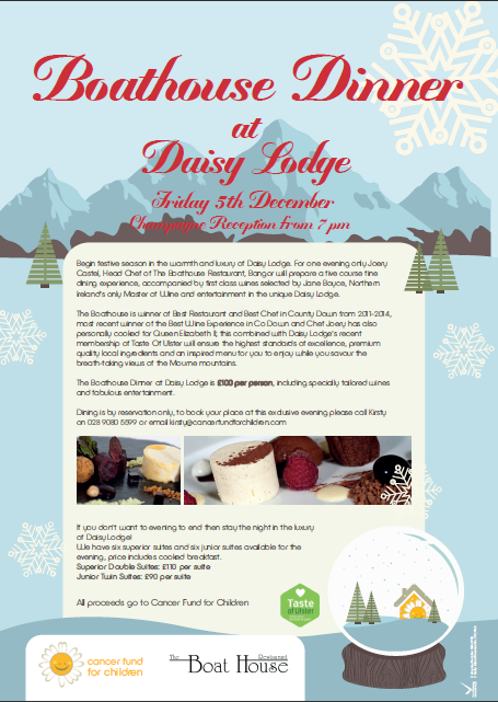 Dining is by reservation only, to book your place at this exclusive evening please call Kirsty on 028 9080 5599 or email kirsty@cancerfundforchildren.com