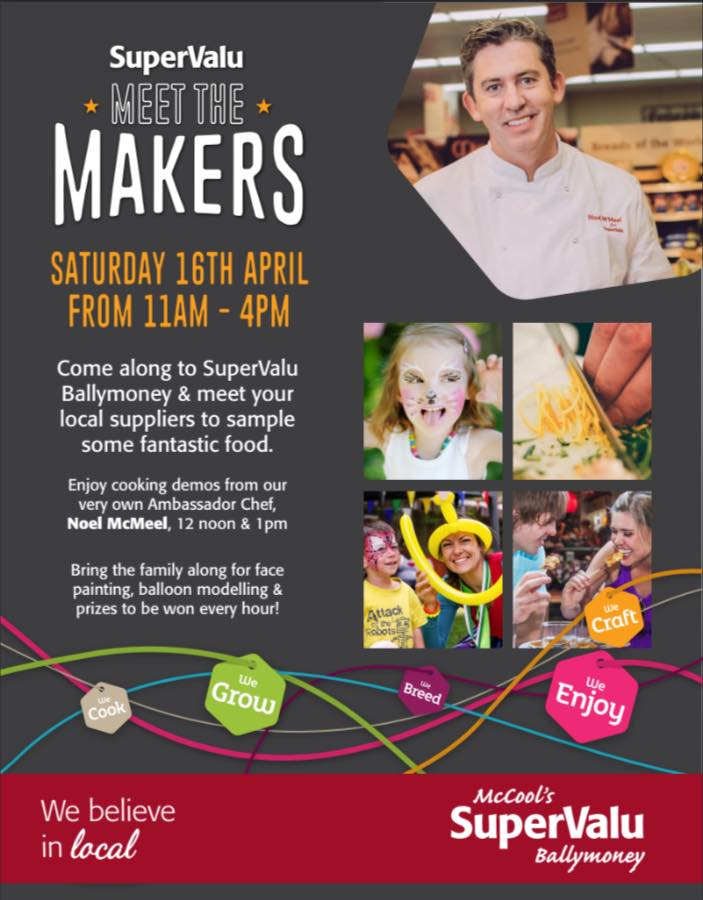 SuperValu Ballymoney will be having a fun filled day Saturday 16th April and we would like to invite all our customers to join us!! We will have over 60 different suppliers in our store sampling their products, everything from chicken, sausages, jams, sauces, cakes, ice cream, sweets, wines, craft beers and so much more!