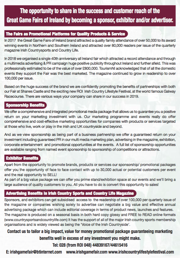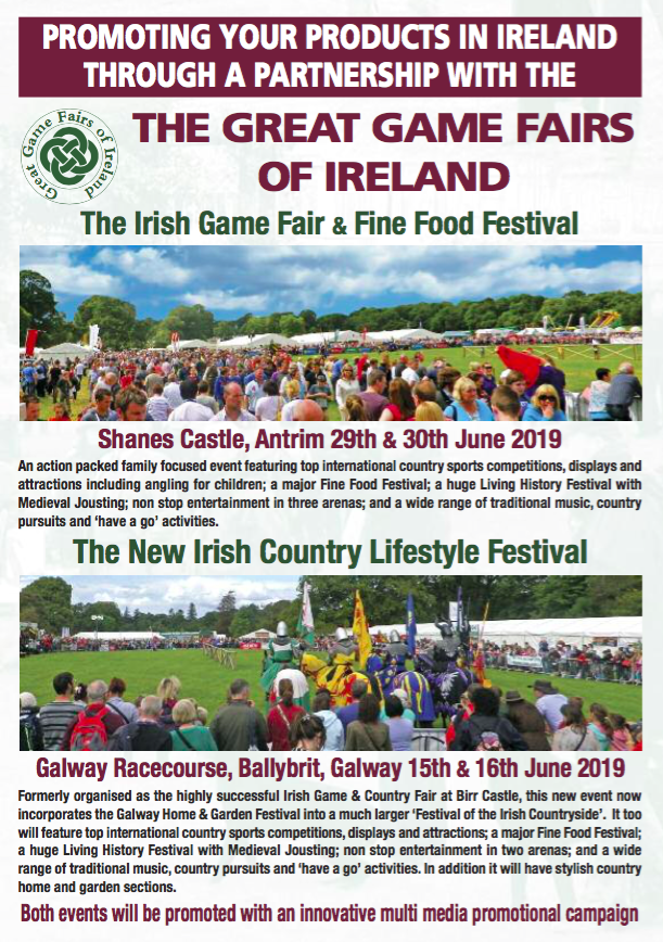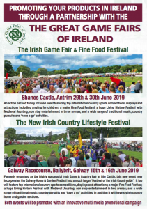 The Irish Game Fair & Fine Food Festival Posted on January 29, 2019February 5, 2019 Loading Map.... Shane’s Castle EstateRandalstown Road - Co.AntrimEvents 54.7260915 -6.2896392000000105 Date/Time Date(s) - 29/01/2019 - 30/01/201912:00 am Location Shane’s Castle Estate Randalstown Road Co.Antrim BT41 4NE Northern Ireland