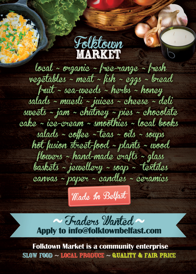 The Folktown Market is located in the newly refurbished Bank Square, where new surfaces and lights, along with a large and bright new public artwork are leading people in from Royal Avenue.