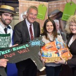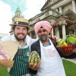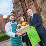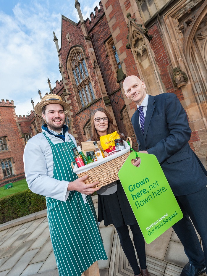 Sarah Campbell from FoodNI, Charlie Cole from Broughgammon Farm and Chris Elliott, Director of Queens Universitys Institute for Global Food Security, show off some of the home-grown products that were on offer at the FoodNI Artisan Market at Queens.