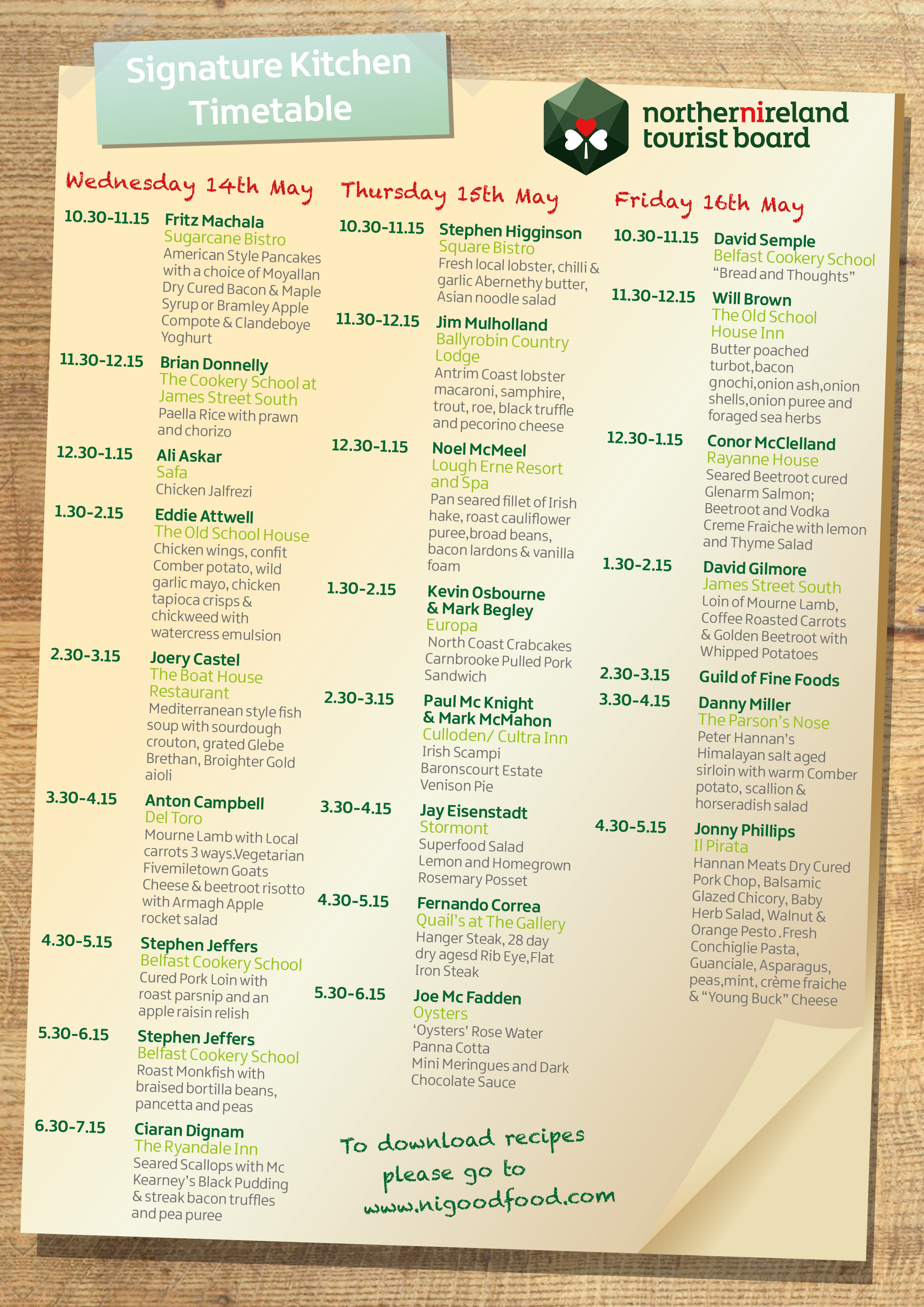 Elaine Groves, NITB comments, “The Northern Ireland Signature Kitchen is a fantastic platform to tell visitors the unique stories behind our award winning local food produce, as well as celebrate the culinary skills of our top chefs. The Food NI Pavilion is always exceptionally busy and it’s great to see visitors sampling our best food produce cooked by local chefs; a true Northern Ireland food experience”.
