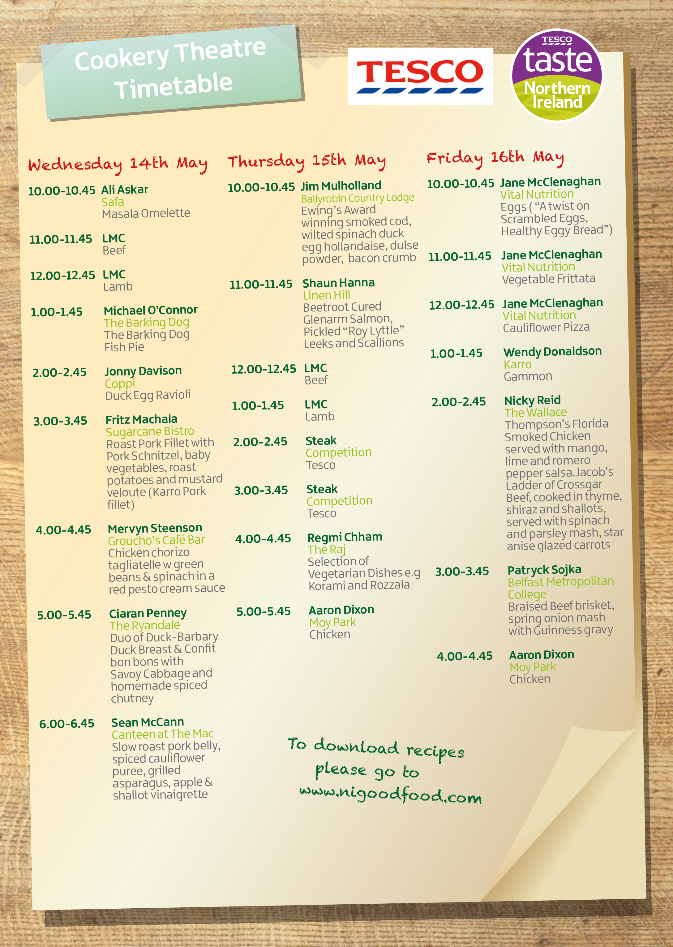 Caoimhe Mannion from Tesco said, “Tesco is delighted to sponsor the key Cookery Theatre at this year’s Food Pavilion at the Balmoral Show. We look forward to meeting lots of our local suppliers and visitors over the 3 days. We hope everybody will enjoy the mouth-watering cooking demonstrations, and look out on Friday for Patryk Sojka, the student chef from Belfast Met who won our Tesco Home Grown Talent Bursary!”
