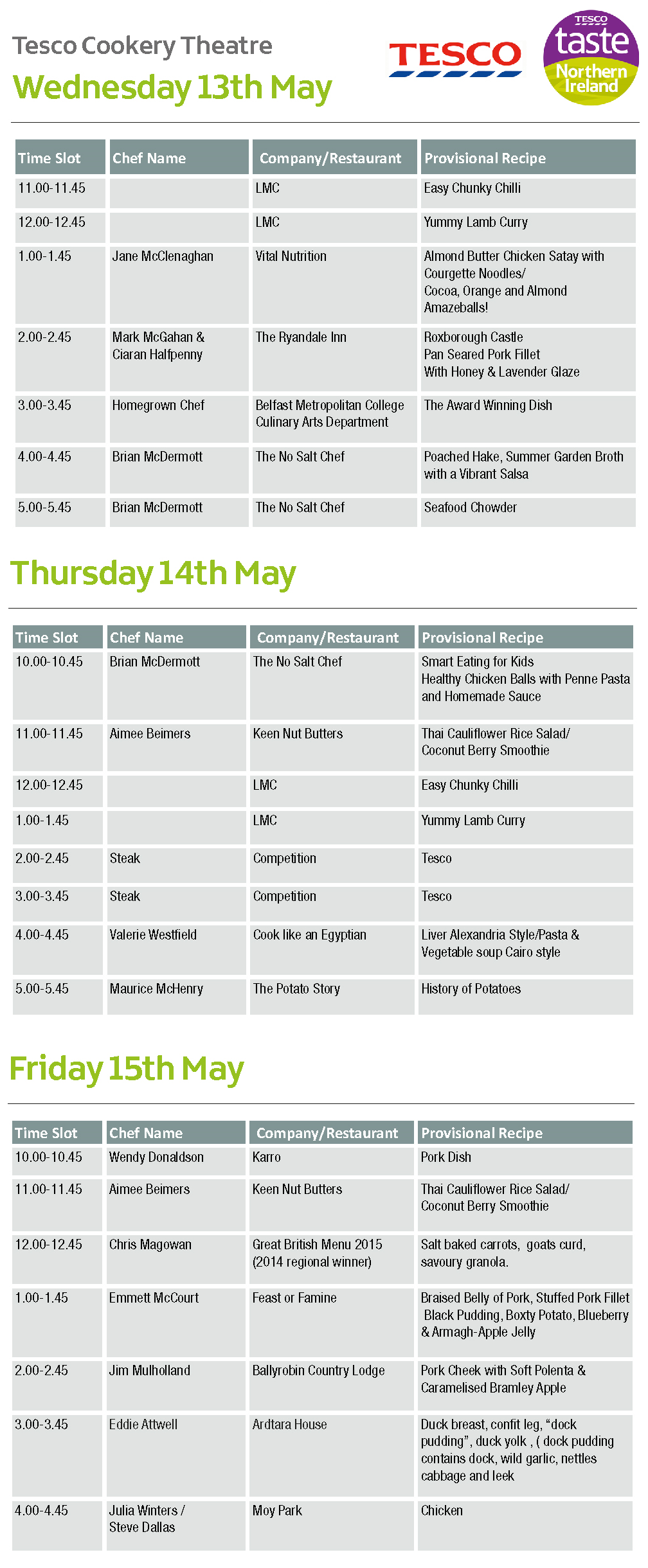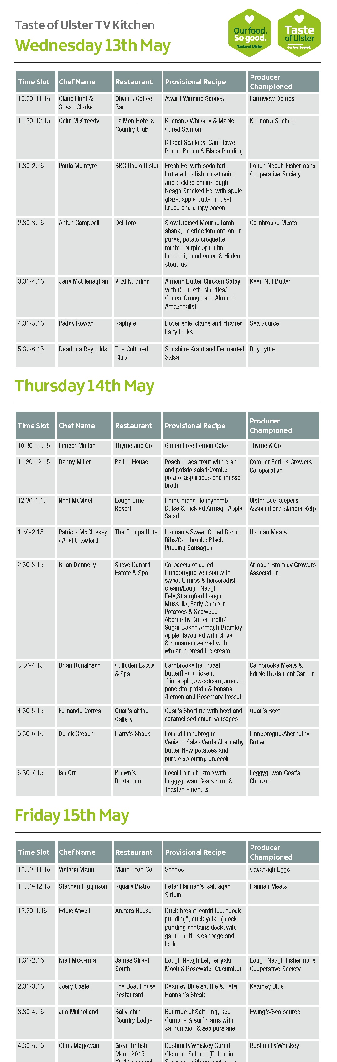 The Wild Hog, Moy Park, Tayto, Dale Farm, Mulllins, Avondale, Indie Fude, Harnett’s Oils, Armagh Cider, Dart Mountain Cheese Company, Made with Love xo, Broighter Gold Rapeseed Oil, SD Bells, Irwin’s, Milgro Onions, Long Meadow Cider, Mash Direct, The Big Lunch, Hovis Ltd, Thompson Family Teas, Annaghmore Mushrooms, Kennedy Bacon, Broughgammon Farm, Foodie Folk, Glastry Farm, Your Food Stories, Whites Oats, Neary Nogs, Krazi Baker, Eleanor Craigs Fudge, Linwoods, Thyme and Co , The Heatherlea Cavanagh, Free Range Eggs, Glenballyeamon Eggs, Genesis Crafty, Biosearch, Burren Balsamics, Flavour of Tyrone, Little Treats NI, Hollah Preserving, Soil Association, Wilsons Country, Sauce Works, Karro Cookstown, Food Standards Agency, Just Live a Little, Simply Fruit, Glens of Antrim, P McCanns and Sons, Sea Source, c/o Anifpo, Comber Early Growers Co-Operative, Erin Grove Preserves, Jolly Pies, Homemade by Manns, Miss McKeown’s Tea, Craigavon Heartland, Kearney Blue Cheese, Braemar Ice Cream, Talks and Tastings Area.